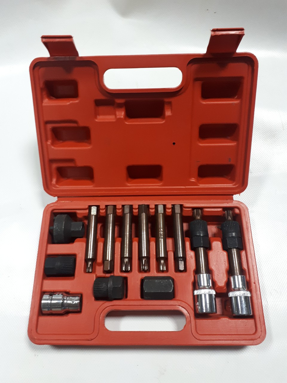 Специальный набор для разборки генератора (191385) Специальный набор для удаления шкивов генераторов (тип свободного хода) производства Bosch, Valeo и Marelli. Для большинства типов транспортных средств. Поставляется в литом пластиковом корпусе. В комплект входят следующие части: M10 сплайн х 1/2 «D для генераторов Bosch T50 х 1/2» D шестигранные биты: 8/10 мм биты Сплайны: M8/M10 отвертка: T40/T50 2 х 1/2 «D M10 сплайна биты 110 mm/64 мм 1/2 «D адаптер для 10mm HEX 2 шкива муфты и два адаптера HEX адаптер 21 х 28 мм.