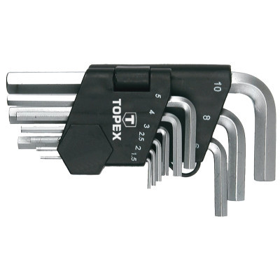Набор шестигранных ключей TOPEX (35D955) имеет комплектацию в следующих размерах: 1,5; 2; 2,5; 3; 4; 5; 6; 8; 10 мм.