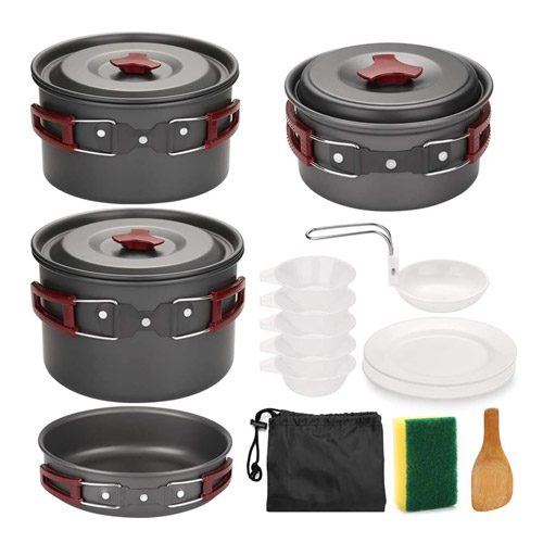 Набор посуды для кемпинга на 4-5 персоны, который однозначно пригодится любителям походов, кемпинга и отдыха на природе. Преимущество данного набора – это складные ручки, за счет которых есть возможность всё компактно сложить.